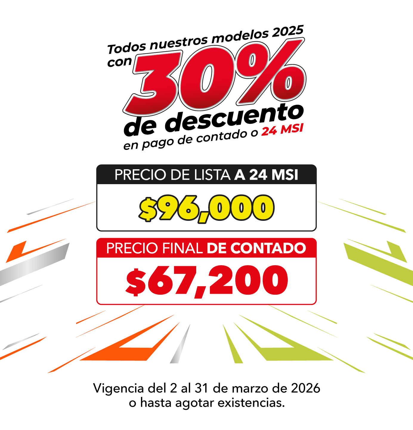Modelos 2025. No acumulable con otras promociones. Todos los precios incluyen IVA. Colores y modelos sujetos a disponibilidad. Entrega de 10 a 20 días después de la compra. Válido del 02 al 31 marzo 2026 o hasta agotar existencias. Consulta Términos y condiciones.